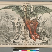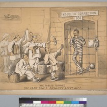 White labor unions blamed the Chinese for lower wages and lack of jobs, and anti-Chinese feelings grew. The cartoon "You Know How It Is Yourself" expresses this sentiment. Several political cartoons in this topic are graphic representations of racism and conflicts between whites and Chinese. "Won't They Remain Here in Spite of the New Constitution?" shows a demonized figure of political corruption protecting Chinese cheap labor, dirty politicians, capital, and financiers. "The Tables Turned" shows Denis Kearney (head of the Workingman's Party of California, a union that had criticized Chinese laborers) in jail, being taunted by Chinese men.