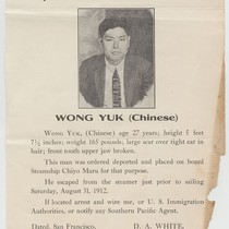 The "Certificate of Residence" document illustrates that Chinese individuals were required to prove their residence in the United States prior to the passage of the Exclusion Act. The poster offering a reward for Wong Yuk, a Chinese man, makes it clear that the United States was actively deporting Chinese.