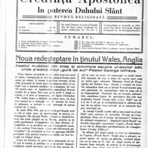 Apostolic Faith - In the Power of Holy Spirit is the periodical publication of the penticostal group named "Apostolic Pentecostal Church of God - Christian Baptized in the Holy Spirit" from Romania between 1932 & 1934. [Description English/roman)] Credinţa Apostolică - În puterea Duhului Sfânt este publicatia periodica a grupului penticostal cunoscut sub denumirea "Biserica lui Dumnezeu Apostolică Penticostală - Creştini Botezaţi cu Duhul Sfânt" din Romania intre anii 1932-1934. [Description (original non-English/roman language/script)]