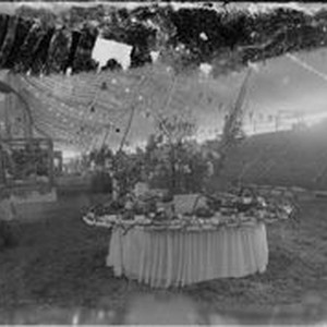 Negative glass-plate photo: From a glass plate negative made by William Borba. Gravenstein Apple Show exhibit circa 1915 in Sebastopol. Various displays under the tent at the Apple Fair.
