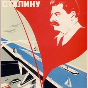 A poster dedicated to the opening of the Moscow-Volga Canal (later, Moscow Canal) in 1937. Captions on top read, "Slava velikomu Stalinu / Слава великому Сталину" meaning, "Hail great Stalin". Captions at the bottom read, "Kanal Moskva-Volga otkryt! / Канал Москва-Волга открыт!" meaning, "The Moscow-Volga Canal is now open!". [Description English/roman)]