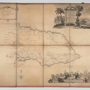 Cartouche: Elaborate harbor scene; Stair steps around scale. . Relief: no. Graphic Scale: Miles. Projection: Plane. Printing Process: Copper engraving. Other Features: Cartouche. Verso Text: Red ribbon, Label with MS note: Parish of St. George the Blue Portland St. Thomas in the East St. Andrew Port Royal St. David..