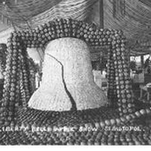 Postcard--black and white: 1915 Gravenstein Apple Show exhibit of the Liberty Bell made of whole and sliced dried apples.