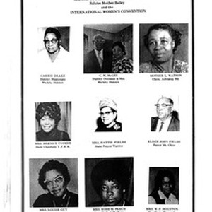 Four pages from an unidentified Church of God in Christ publication, [s.d.]. "The Wichita District of Kansas Southwest Jurisdiction salutes Mother Bailey and the International Women's Convention" "Kansas Southwest Jurisdiction congratulations and best wishes" "Voice of missions" (a brief history synopsis of international evangelist foreign missionary Pearl Page) "Sunshine Band". [Description English/roman)]