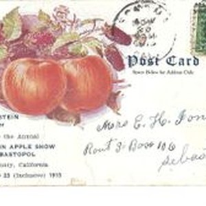 Postcard--color: A 1913 Gravenstein Apple Show advertisement postcard, postmarked and with a 1 cent stamp. Addressed to Mrs. E. H. Jones of Sebastopol. Handwritten message on verso.