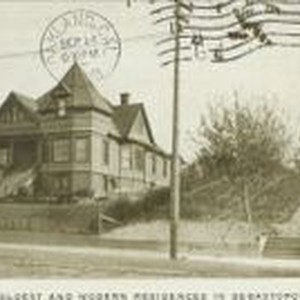 Postcard, black and white, photo: Caption: "One of the oldest and modern residences in Sebastopol, Cal." The was Sebastopol's Hillside Hospital "Old Hospital of Sebastopol." Handwritten note on back to a Mrs. George J. Ely of Oakland and 1cent stamp and postmarked Sept 14, 1908. The Hillside Hospital was a Queen Anne house located south of the current Masonic Lodge in Sebastopol at 327 North Main Street. Dr. John Keating owned the house, establishing a medical practice there. In 1934 the home was renovated into the Hillside Hospital.