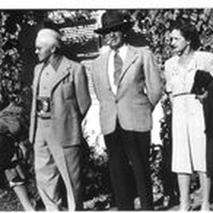 Photo--black and white: Charles R. and Eva Myers (on left) standing outside a vine covered house or building in 1945. Another couple on right are unidentified.
