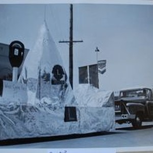Photo--black and white: Sebastopol Lions Club scrapbook photo: Apple Blossom Parade circa 1955 with Sebastopol Lions Club float in the shape of a pyramid and a parking meter, with Sebastopol Post Office in background. Second photo with Congregational Church in background and third photo with P&SR depot in background.