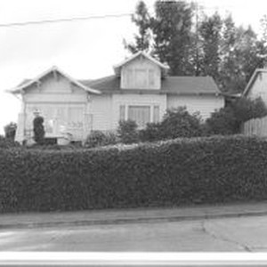 Photo, black and white: Sebastopol house at 7301 Calder Avenue a Craftsman bungalow built in 1915 in the Valle Vista Addition. House photographed in 1993 by Evelyn McClure for her book "Sebastopol, California : History, Homes and People."