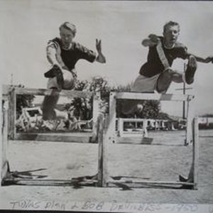 Analy High School Tigers track team, 1950--Twins Dick and Bob DeVilbiss, Analy hurdlers; Wes Nott receiving pole vault 1st place medal at the El Cerrito Relays 1950; unidentified Tigers participant receiving 1st place award at the El Cerrito Relays