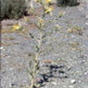 Plant with yellow flowers in desert with shrubs in background.
