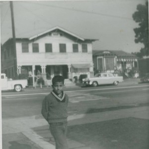 Beto Licon stands in the foreground across the street from a Craftsman home and street-parked vehicles, 1963.