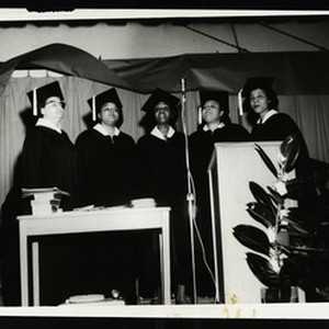 Photograph of five women at graduation. "Sarah on left. She was a Jubilee harmonizer" -- back. [Description English/roman)]