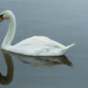 Close up of white-feathered swan sitting on calm waters.