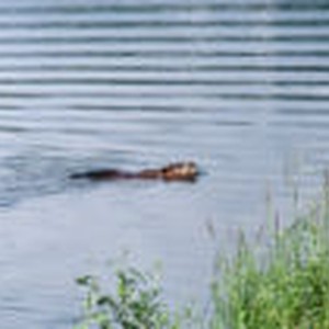 Beaver swimming with its nose above the water near North Face Lodge.
