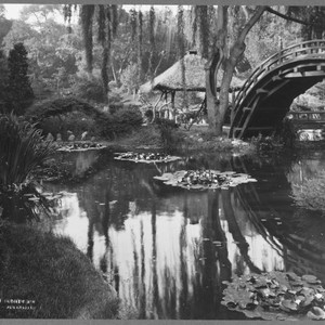 View of the ponds of the Japanese garden, with the steeply sloping drum bridge on the right and a thatched hut in the center. In lower left corner: © Henry E. Huntington Library and Art Gallery.