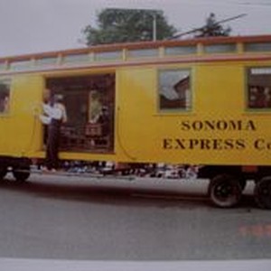 Photo--color: Apple Blossom Parade, Sebastopol April 15, 2000. The restored Petaluma & Santa Rosa Railway boxcar, restored by Millerich Brothers.