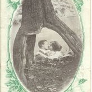 Postcard--color and black and white print: Greeting card--Picture of man and woman kissing. Handwritten note on back. Postmarked Coalinga, CA Sept. 17, 1913.