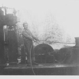 Photo--black and white: Young Bob Sturgeon working steam donkey spool at Sturgeon's Sawmill. Caption by Ralph S. Sturgeon: "This steam donkey--Dolber Carson from Willow Creek Sawmill, Sonoma County--bought by Donati-Gonnella & Wade Sturgeon mid 1920's, hauled here by Beedle Brothers, Occidental, solid tire truck--Kleiber & Kinsel? Down on flat north of sawmill--2150 Green Hill Road known as Ronte(?) at time of this snap shot. Robert Wade Sturgeon--early 1940's. When Ejnar and I bought sawmill from Donati, Gonnella & Sturgeon, we set up a pole & brow log & loaded 1924 Dorris truck from stockpile here. Five wraps on spool would pick up quite a load with out slipping, 7 wraps was about limit for wraps. The trick was to twist line for wraps needed. Ejnar ran donkey & tended spool as I loaded, straight line & bucket (11/16" roebling line. Got good at chocking center. R.S. S"