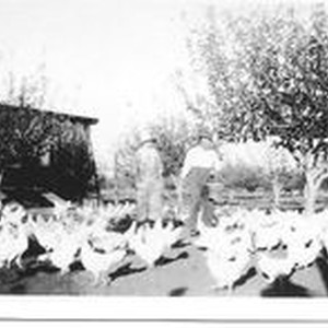 Print: black and white: Lillian and Harry Rosebrook feeding their chickens at their farm in Sebastopol. An orchard of cherry trees are seen in the background. Circa 1920's.