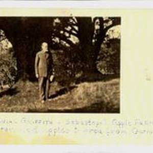 Photo--sepia: Nathaniel A. Griffith standing in front of several large trees and an apple orchard beyond. Griffith was an apple farmer who introduced the Gravenstein apple to the Sebastopol area at Vine Hill in 1890.