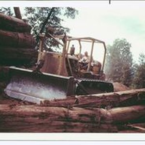 Photo, color: Harry Welsh operating D7 Cat circa 1951. Redwood logs on either side of the Cat.