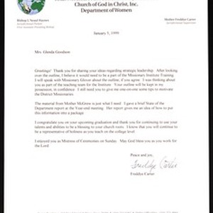 Freddye Carter, 317 Hood Street, Waco, Texas (Church of God in Christ, Texas northeast jurisdiction, Department of Women), letter, 1999 January 5, to Glenda Goodson. [Description English/roman)]