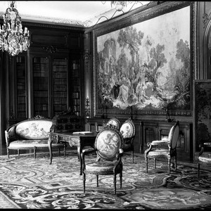 View shows Louis XV furniture arranged on a large area carpet and a Beauvais tapestry, "The Bird Catchers." The writing desk and filing cabinet (bureau plat et cartonnier), attributed to Etienne Doirat, are from 1720 to 1732. The settee and chairs belong to the set of two settees and ten chairs whose upholstery covers were woven at Gobelins Manufactory, Paris, probably under the supervision of Jacques Neilson (1714-1788), after design by François Boucher (1703-1770) and Jean-Baptiste Oudry (1733-1755). The covers were woven circa 1779, and the frames are nineteenth century. The screen on the right is a six-panel folding screen (paravent) made at the Savonnerie Manufactory, Chaillot workshop, Paris, after designs by Alexandre-François Desportes (1661-1743), made between 1719 and 1784; the frame is of a later date. Label accompanying photograph in album reads "HEH 15 West end, Library room in Huntington Art Gallery. Louis XV and Louis XVI furniture. Beauvais tapestry, "The Bird Catchers," designed by Boucher." Appeared in Westways, March 1938. Appeared in San Marino Tribune, April 22, 1937.