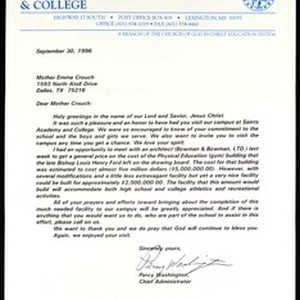 Percy Washington (Saints Academy & College), letter, 1996 September 30, Highway 17 South, Lexington, Mississippi, to Emma Crouch, 1593 North Atoll Drive, Dallas, Texas. Includes envelope. [Description English/roman)]