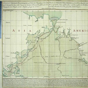Kashnor notes, "See note describing publication in Gentleman's Magazine in 1780 and in Cook's 1781 journal, signed T. A. Mann, 1781." Note in both French and German describes the voyages of the main explorers whose paths are shown on the map. Prime meridian: London. Relief: no. Projection: Mercator. Watermark: Arrow up over M G. Printing Process: Copper engraving. Verso Text: MS notes; 8 150216.