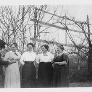 Photo--black and white: Four of Isaac W. Sullivan's married daughters and an unidentified man. From L to R: man, Sophronia Street, Amanda Gaillard, Letha Coyan and Minerva "Nerva" Newell circa 1890s. The women are standing outside in front of a trellis. The man appears to be posing Mrs. Street for the picture.