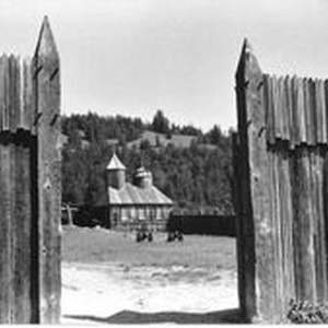 Photo--Black and white: The chapel at Fort Ross California about 2000. The chapel can be seen through the wooden gate. Two cannon stand in front of the chapel. Fort Ross was the first Russian settlement in California.