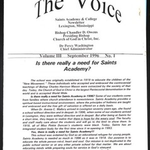 The voice, vol. 3, no. 1 (1996 September). Saints Academy & College (Lexington, Mississippi) newsletter. [Description English/roman)]
