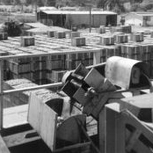 Photo--Black and white: Pleasant Hill Dryer 1961. Boxes of apples are seen in background. The machine in front is an apple grader. Apples were graded as #1, #2 or juice and were looked at by size and amount of pests (worms). The Pleasant Hill dryer was located at the current (2010) Southpoint Avenue.