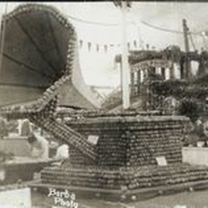 Postcard -black and white photo: Gravenstein Apple show in Sebastopol, August 20,1913. Apple display made in the form of a gramophone. In background a sign stating "Stony Point." Handwritten on photo "Borba Photo."