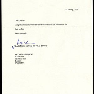 Letter to Charles Handy from Baroness Young of Old Scone congratulating Handy on his Honour in the Millennium list, January 31, 2000; Charles Handy Papers; Box 13, Folder 25; 1 page
