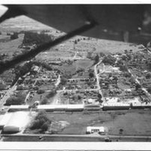 Photo--Black and white: 1950 aerial view of O. A. Hallberg & Sons processing plant and Cold Storage building in Graton. Downtown Graton is seen behind the cannery.
