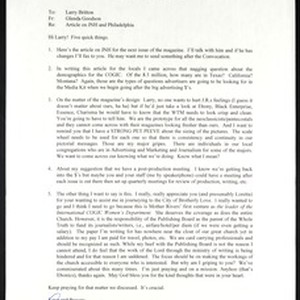 Glenda Goodson, memo, [s.d.], to Larry Britton, re article on JNH and Philadelphia. [Description English/roman)]