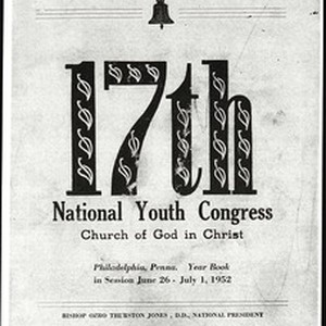 Program book "yearbook" for the 17th National youth congress, Church of God in Christ, Philadelphia, Pennsylvania, 1952 June 26 - July 1. This xerographic exemplar lacks page 12. [Description English/roman)]