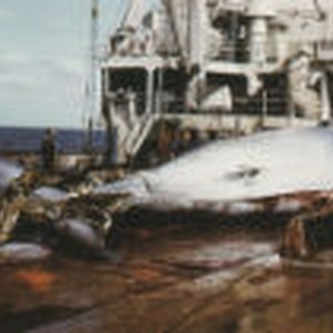A captured whale on the deck of a factory ship.