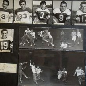 Photo--black and white: Analy High School Tigers football team of fall 1950. Individual pictures in uniform of : Perry, Bob (3) Nuessle, Chas (33) Onoyama, Yoshi (3) Brians, Dave (9) Johnson, Harry (17) Hetts, Don (19). Two photos of the practice game between Analy Tigers and Petaluma. Analy 13--Petaluma 13.