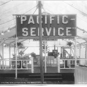 Photo--black and white: 1912 Gravenstein Apple Show display by Pacific Gas & Electric Co. With a large electric sign "Pacific Service,"the display is of an "open" house with various electric lights and appliances on display. Photo caption: "No. 24 Gravenstein Apple Show, 1912 Sebastopol, CAL. Turrill & Miler Photo. S.F."