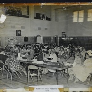 Damaged photograph of a large group of women at the first regional workshop, Church of God in Christ, New Orleans, Louisiana, 1949. "Afternoon session o workshop, regional. Metropolitan council, Baton Rouge, honors regional director A.C.M. R.D. A.C.M. F. presiding Far. C. Williams Oreas R.4. Nation W.S. session meeting, 1949, with Venice Spraggs, Dilliard U. Ensemble intertaining for a reception for R. 4" -- written on back. [Description English/roman)]