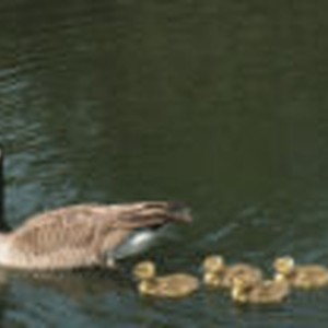Close-up of male goose and four goslings swimming.