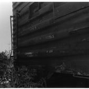 Photo--black and white: P&SR (Petaluma and Santa Rosa) railroad box car put in place behind the Sebastopol P&SR railroad depot that has become the West County Museum run by the Western Sonoma County Historical Society.