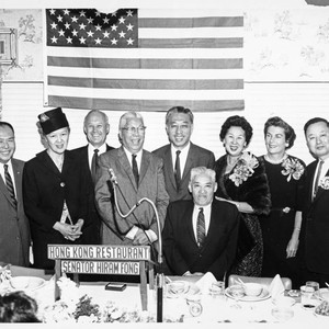 This photo was taken in Los Angeles New Chinatown during the testimonial dinner honoring U. S. Senator Hiram Fong (fifth person from left). Hiram Fong was the Republican United States Senator from Hawaii from 1959 to 1977. He is known for being the first Asian American and Chinese American to be elected to the U. S. Senate. Hong family papers. The Huntington Library, San Marino, CA.