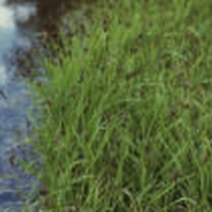 Tall green grasses aligning water. Location indicated is "sedge and edge of farm at Emigrant Lake Camp."
