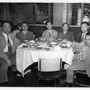 This photograph was probably taken at the21st Biennial Convention of Chinese American Citizens Alliance. Guests at the table include Henry Lem (first left), Thomas S. Wong (second right), Y. C. Hong (first right), and unidentified Chinese American men. Hong family papers. The Huntington Library, San Marino, CA.