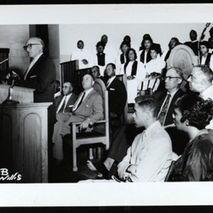 Photograph of Rabbi Winston at the pulpit at Church of God in Christ fundraiser, Chicago, Illinois, for Tel [Av]iv hospital in Israel, [s.d.]. From Corby Bush? "Bishop Ford sponser a fund benefit at St. Paul for hospital in Telaviv Israel. Speaker, Rabbi Winstein, Attn. Payne (Aaron), Bishop L.H. Ford, Dr. Lawless, Rev. Furman" -- written on back. From Corby Bush? "O.B. Willis" -- written on front. "O.B. Willis, photostats & photographs, 412 East 47th Street, Suite 12, Phone KE 8-0211, Res. DO 3-3534, Chicago 15, Ill." -- stamped on back. [Description English/roman)]