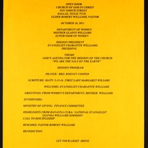 Mission program, "God's agenda for the mission of the church 'we are the salt of the Earth'", Open Door Church of God in Christ, Dallas, Texas, 2011 October 20. [Description English/roman)]